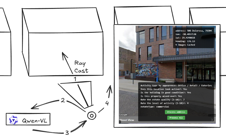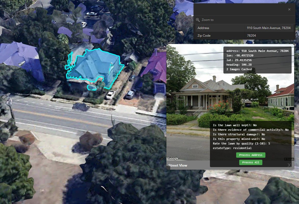 This project presents an automated computer vision system that integrates 3D geospatial data with Vision-Language Models (VLMs) to enable intelligent property assessment at scale. By combining Google 3D Tiles, street view imagery, and building footprint data with the Qwen 3-VL model, the system allows users to interactively query property characteristics through a simple point-and-click interface. The architecture supports multi-angle image capture and analysis, providing comprehensive assessments of residential and commercial properties including usage classification, condition evaluation, and accessibility features. Demonstrated on San Antonio’s 450,000+ properties, the system is globally extensible to any city with available footprint data and street view coverage.